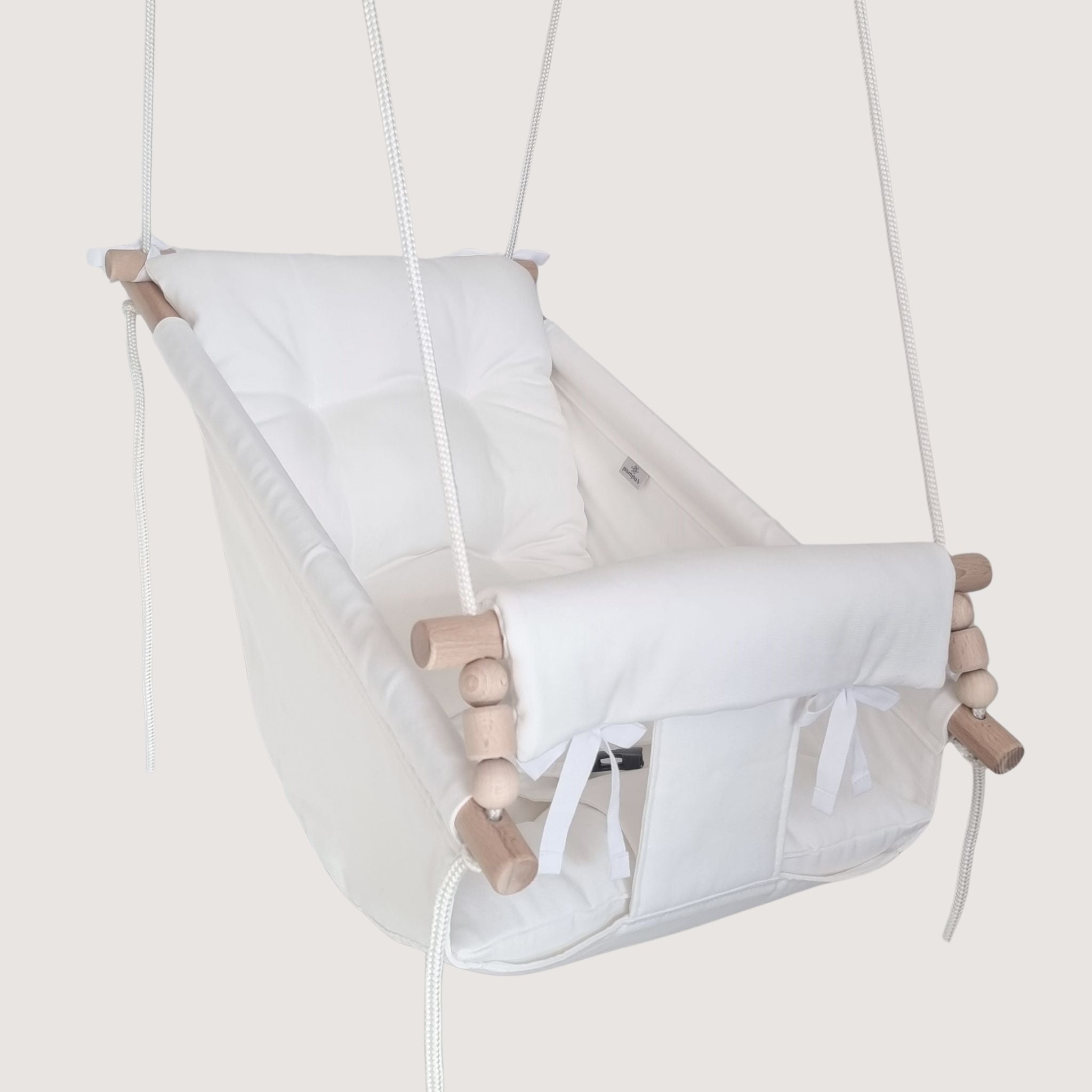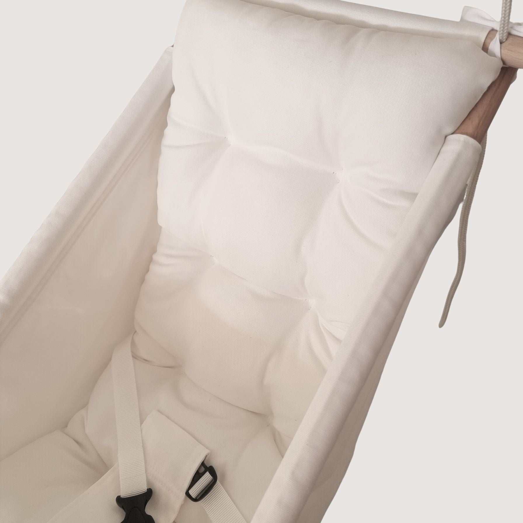 👌🏽Hammock is skillfully crafted with top quality fabrics (natural not allergic). Canvas are sewn from durable and double material and have a solid, double stitching that constitute as an additional safety. Front – padded. Comes with 3 points seat belt to keep child safe while in the hammock. Fabric seat can be removed by untying the knots under each dowel.