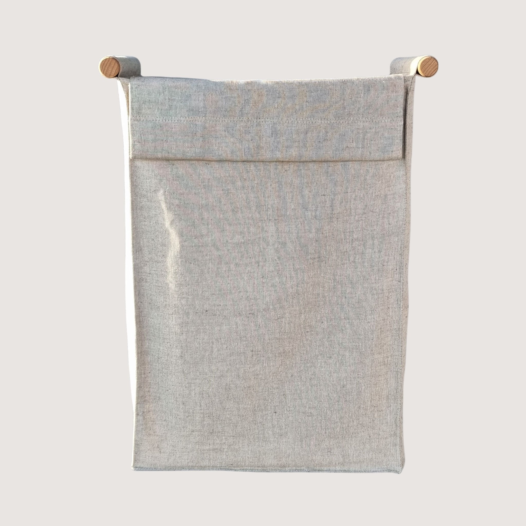 Laundry organizer crafted from a durable fabric with two beech wood hooks.