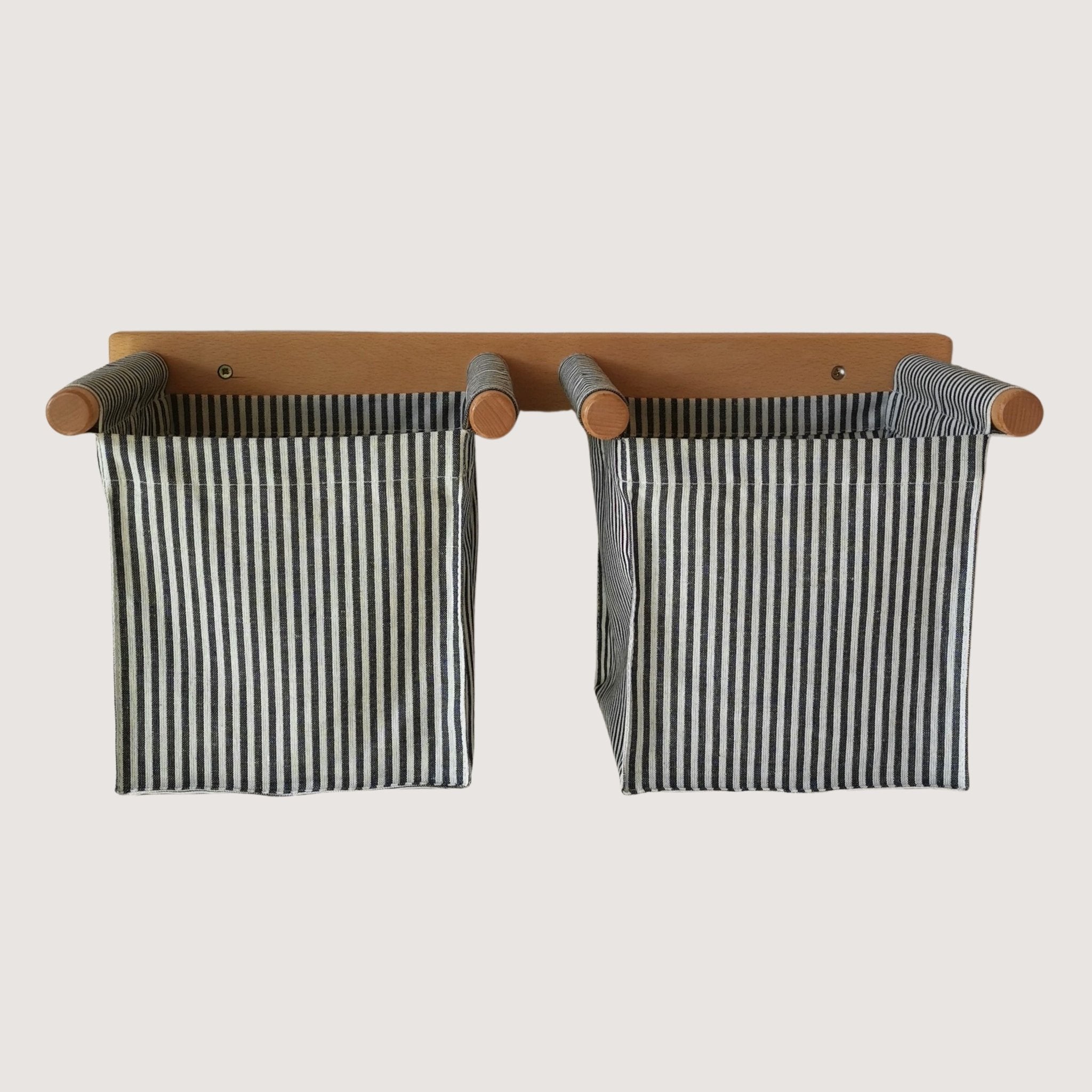 Baskets crafted from a durable fabric mounted on beech wood frame .