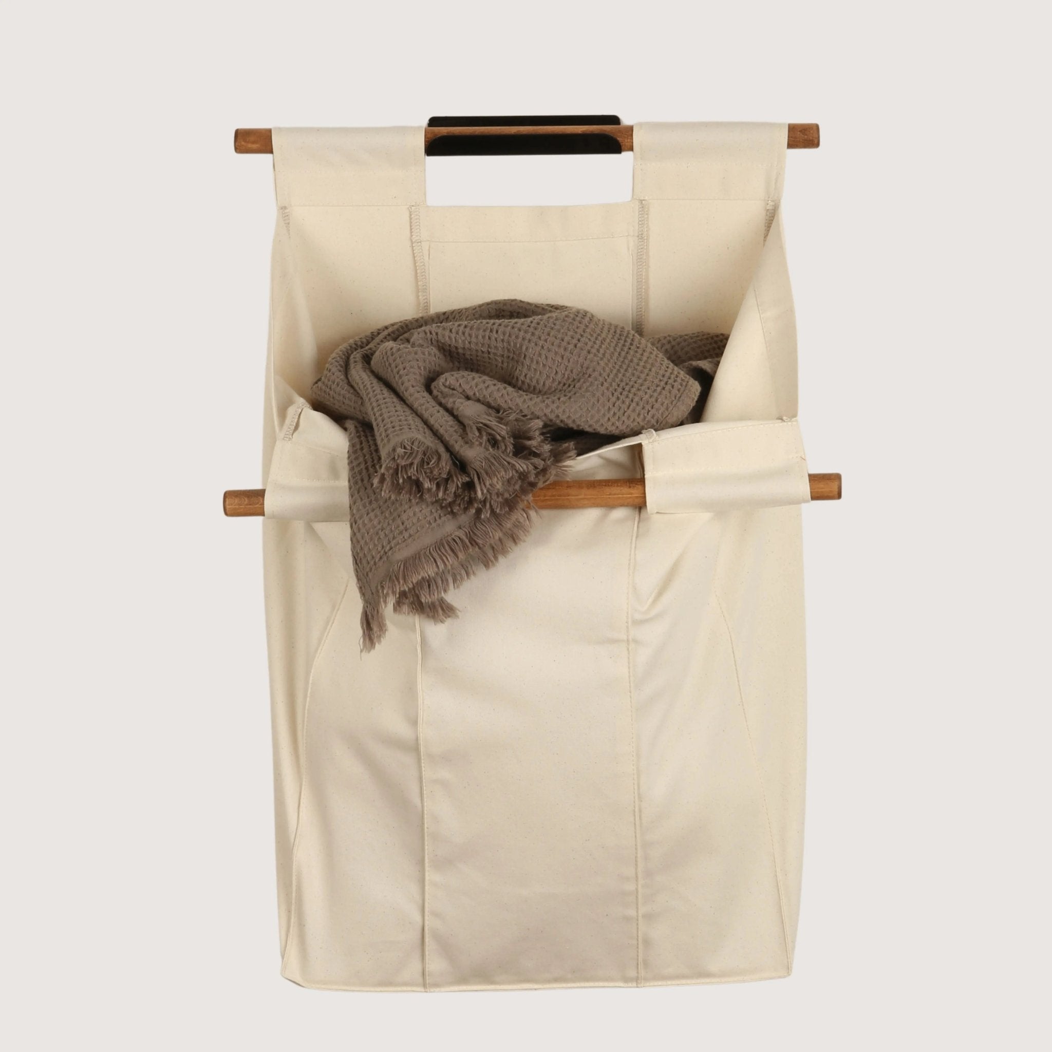Storage organization hamper crafted from a durable fabric with beechwood handles so that it’s easy to haul dirty clothes off to the laundry room.